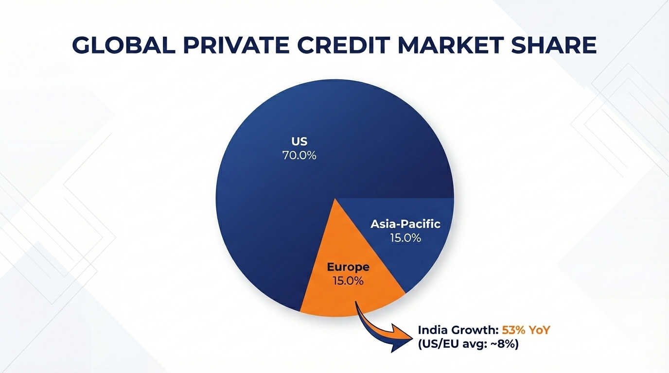 The US has historically accounted for about 70%+ of the private credit market, but the growth story is shifting toward Asia-Pacific, especially India, where reported growth has been as high as 53% year-over-year, giving early entrants a first-mover advantage with faster responsibility and earlier exposure than in more mature markets.